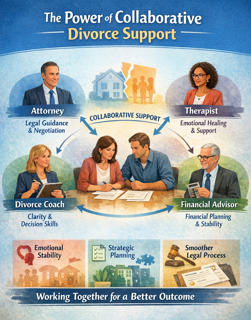 In my practice, I work with clients who navigate this complexity every day. What consistently makes the greatest difference is a collaborative support model—one in which divorce coaching works alongside legal representation and, when appropriate, therapeutic support. When each professional contributes their expertise within clearly defined boundaries, clients experience a process that feels more intentional, less reactive, and ultimately more sustainable.